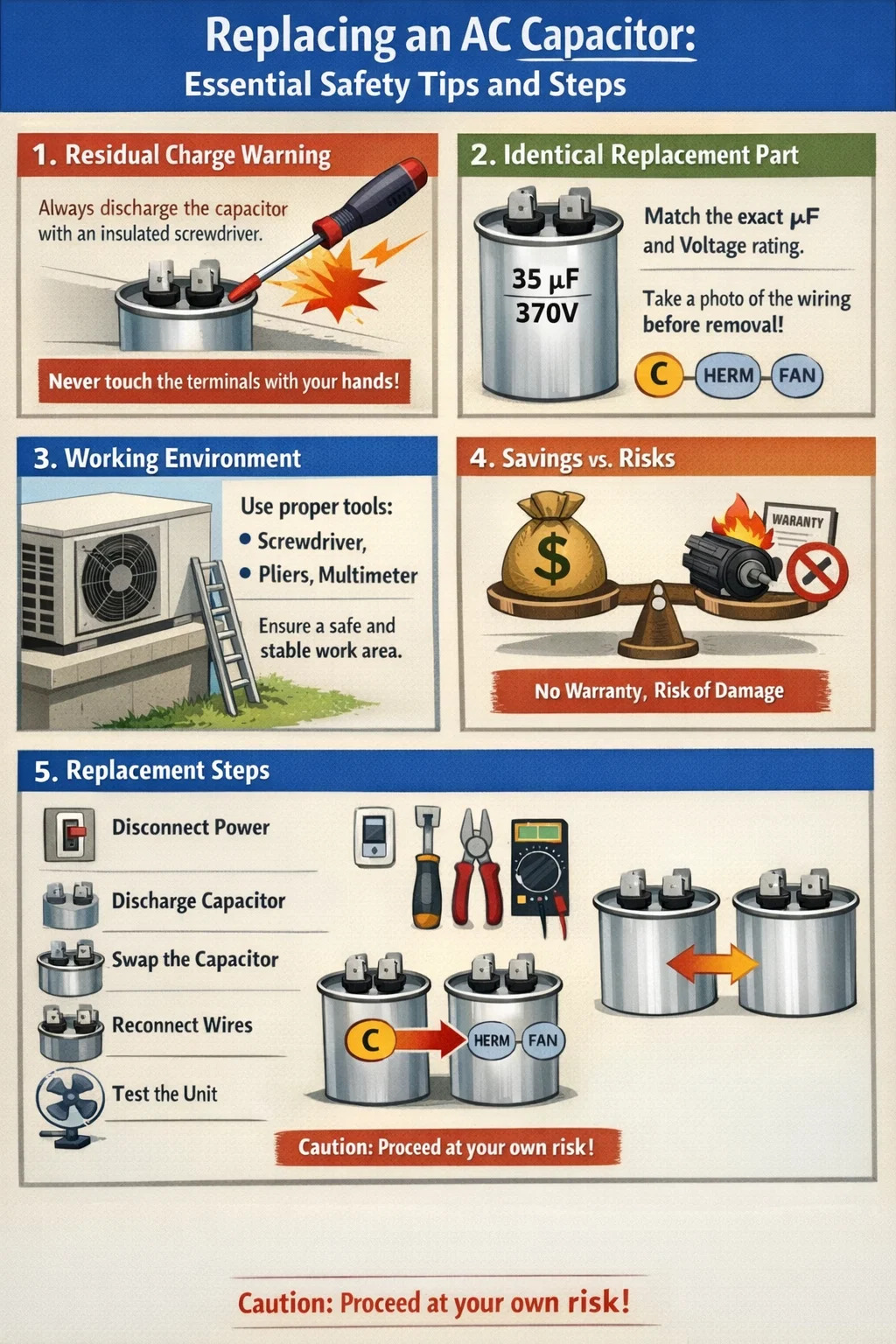 Jamstvo poništeno: Ako je vaš klima uređaj još pod jamstvom, ako sami zamijenite AC kondenzator, možete poništiti jamstvo proizvođača.