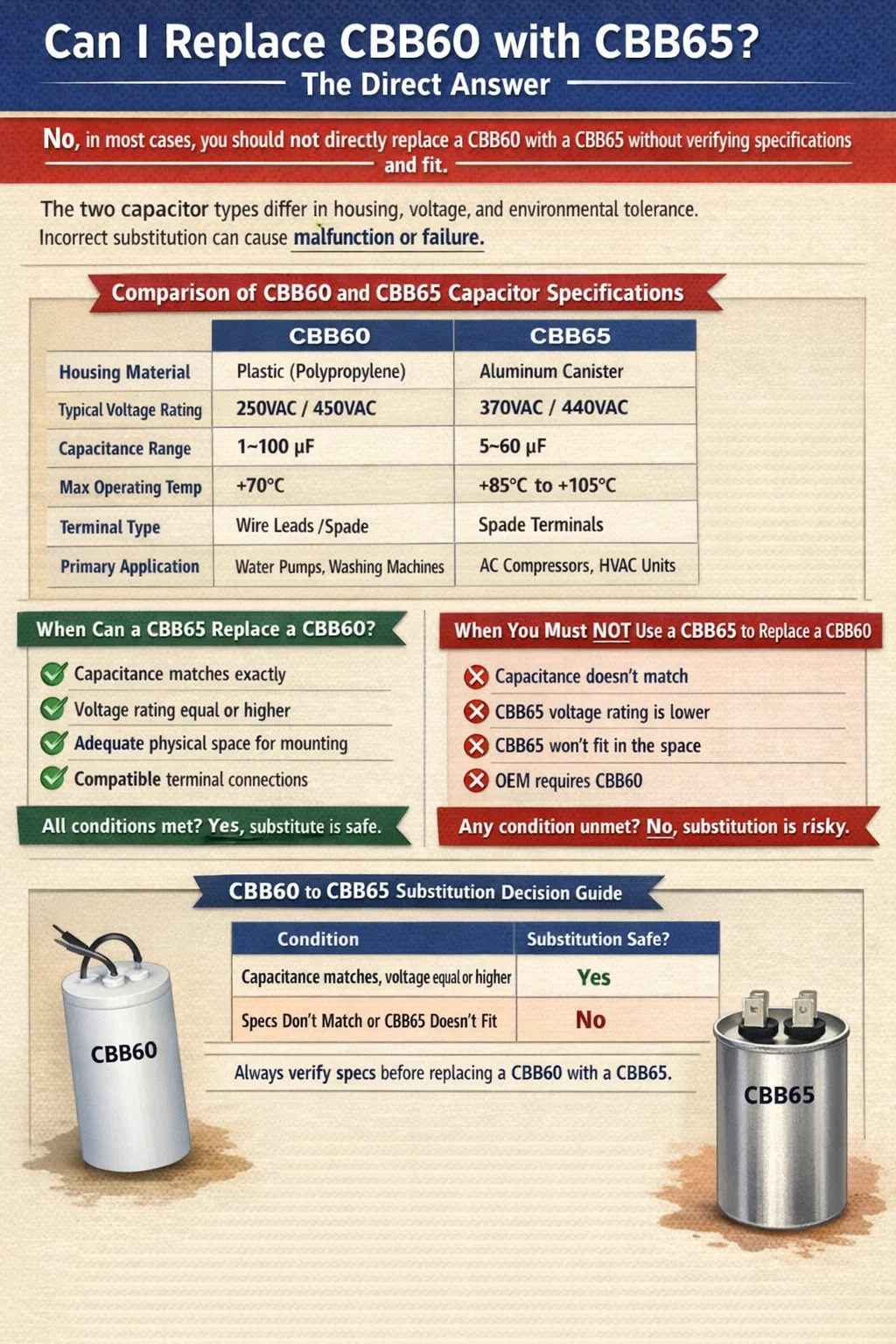Ključni razlozi zašto CBB60 i CBB65 nisu slobodno zamjenjivi