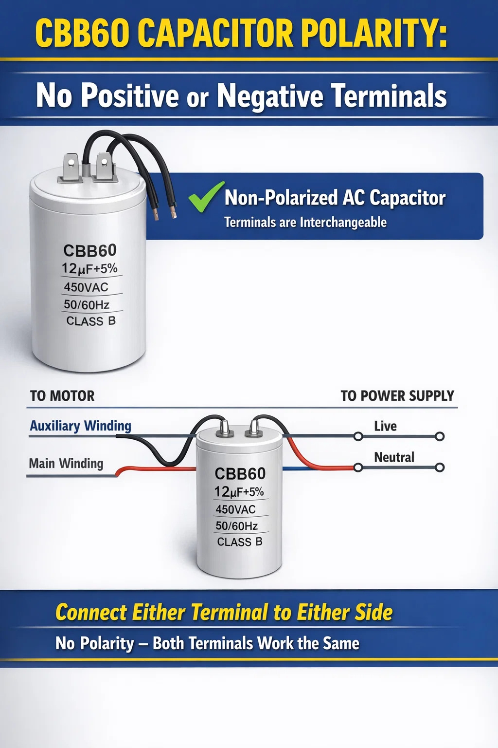 Kondenzator CBB60 je ni pozitivno ni negativno . To je nepolarizirani izmjenični kondenzator, što znači da nema naznačeni pozitivni ili negativni terminal. Možete spojiti bilo koji terminal na bilo koju stranu kruga bez ikakvog rizika od oštećenja ili kvara. Ovo je jedna od najosnovnijih karakteristika koja ga razlikuje od elektrolitskih kondenzatora, koji su strogo polarizirani i neće uspjeti — ili čak eksplodirati — ako se nepravilno spoje.