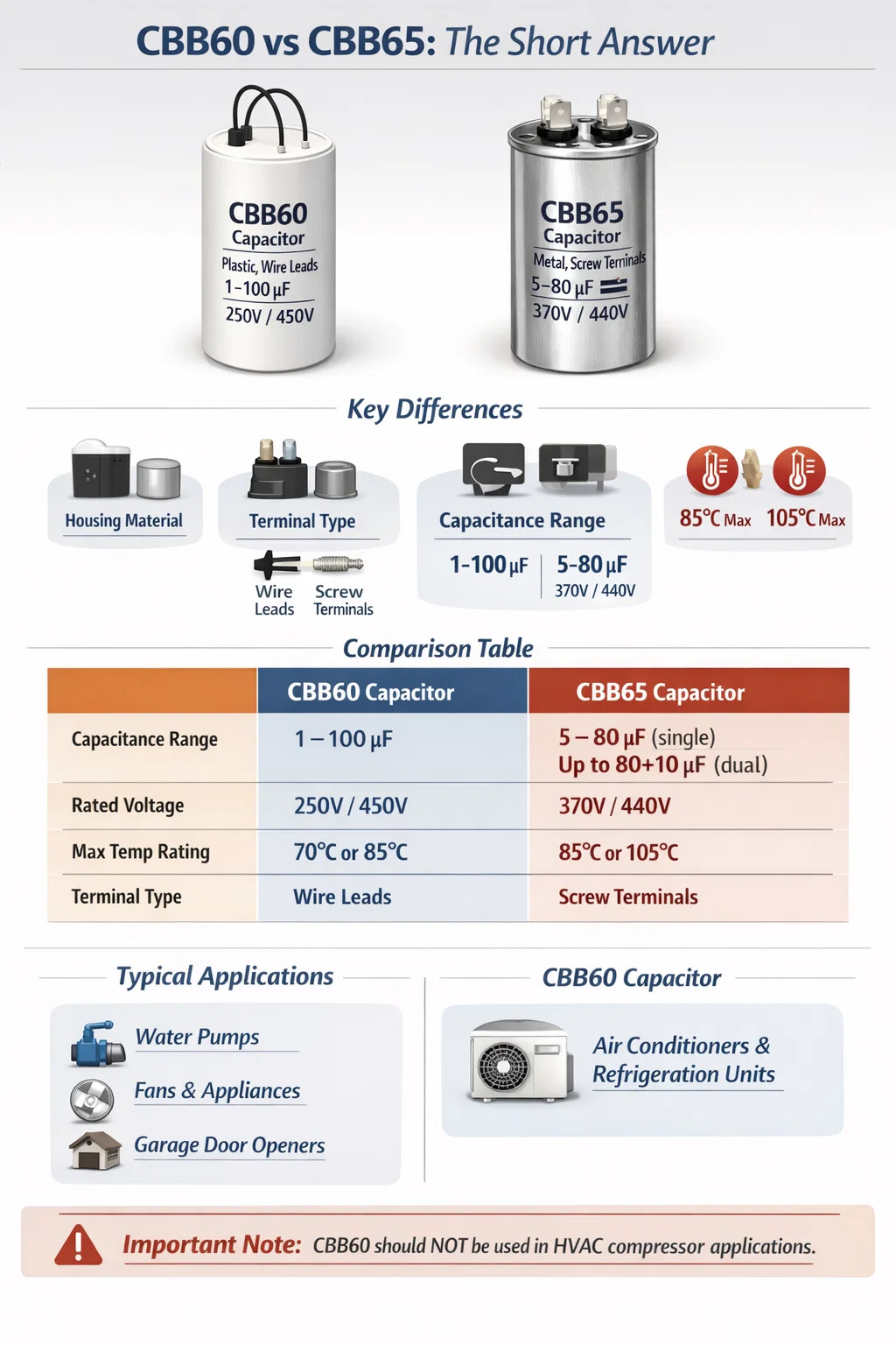 Ukratko: CBB65 može zamijeniti CBB60 u većini aplikacija, ali CBB60 ne bi trebao zamijeniti CBB65 u kompresorskim aplikacijama.