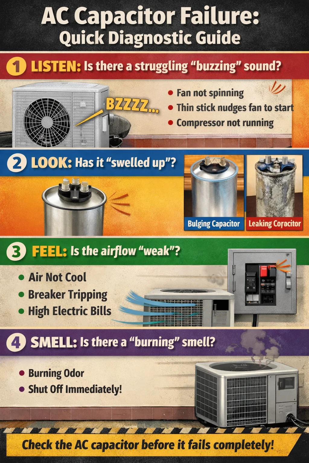 Kada uključite klima uređaj, ako čujete neprekidno "zujanje" iz vanjske jedinice, ali se ventilator ne vrti ili se kompresor ne pokreće, to je obično tipičan znak kvara kondenzatora.