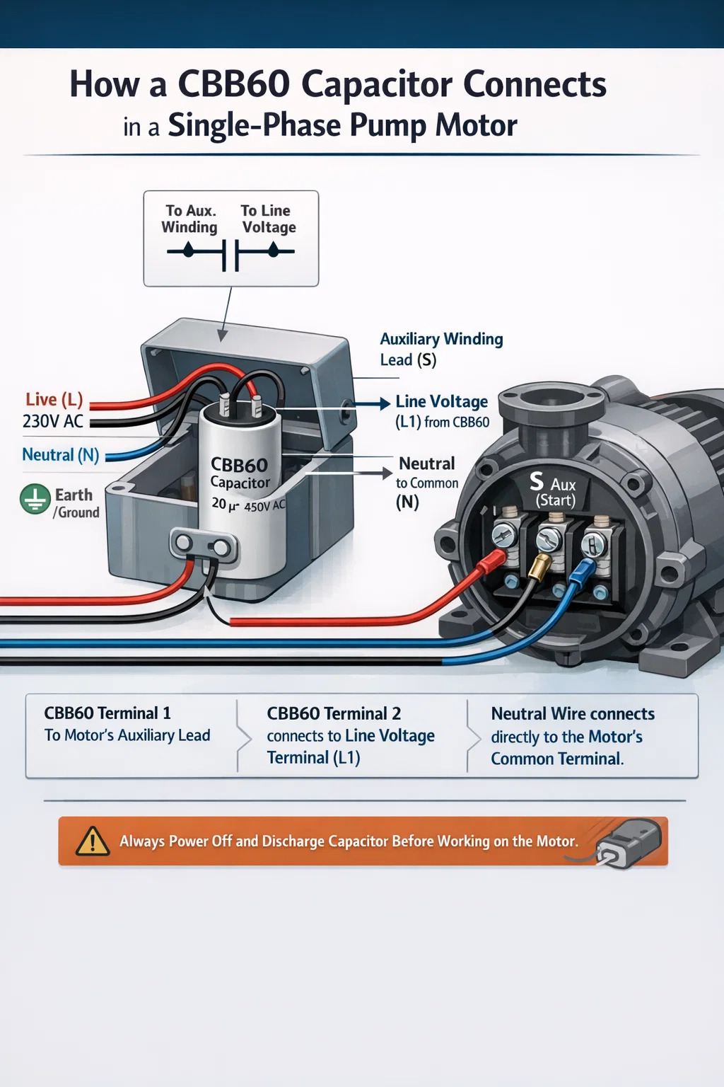 Za najčešći scenarij — jednofazni motor pumpe s vanjskom kondenzatorskom kutijom — dolazna žica pod naponom i pomoćni vod motora slijeću na CBB60, dok se nulti spoj spaja izravno na zajednički terminal motora. Motor radi jer struja kroz kondenzator vodi napon napajanja za otprilike 90 stupnjeva, proizvodeći rotirajuće magnetsko polje koje samo jednofazno napajanje ne može stvoriti.