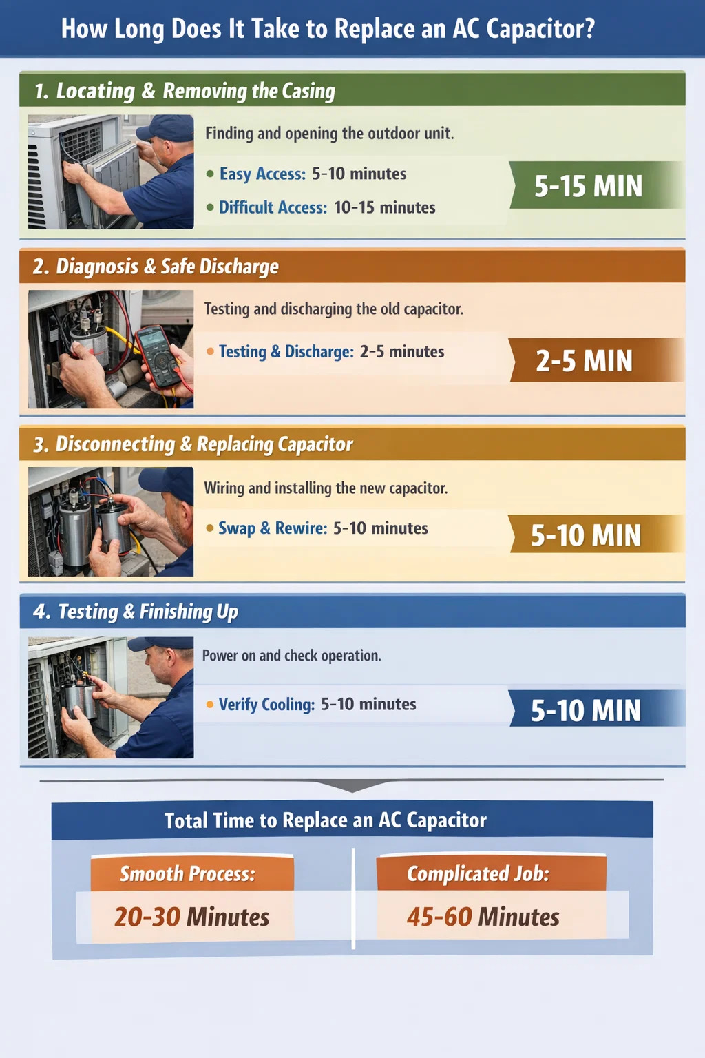 Koliko zapravo traje zamjena AC kondenzator ? Ako samo promatrate nekoliko minuta koliko tehničar radi, mogli biste pomisliti da je posao iznenađujuće brz. Ali od trenutka kada tehničar stigne do ponovnog puhanja hladnog zraka iz klima uređaja, uključen je cijeli proces.