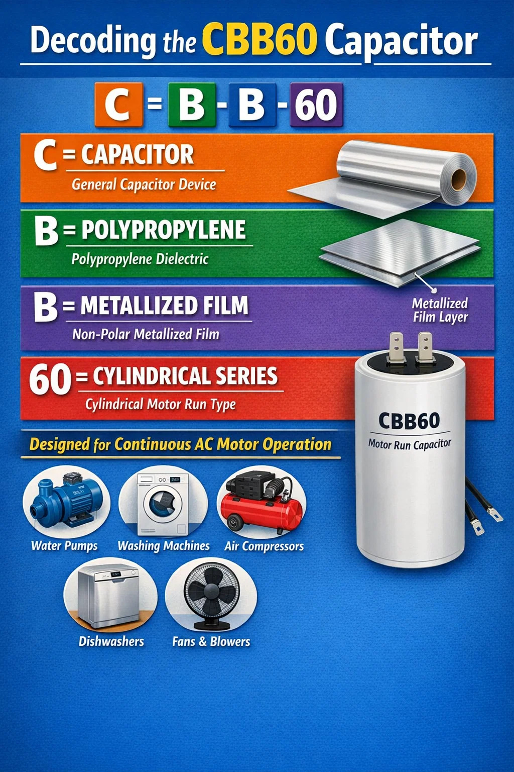 Sam kod je alfanumerička kratica gdje svako slovo ima specifičnu tehničku težinu s obzirom na unutarnju konstrukciju i primjenu uređaja. Za razliku od startnih kondenzatora koji izlaze iz strujnog kruga kada motor postigne brzinu, CBB60 kondenzator napravljen je za izdržljivost i kontinuirani električni rad.