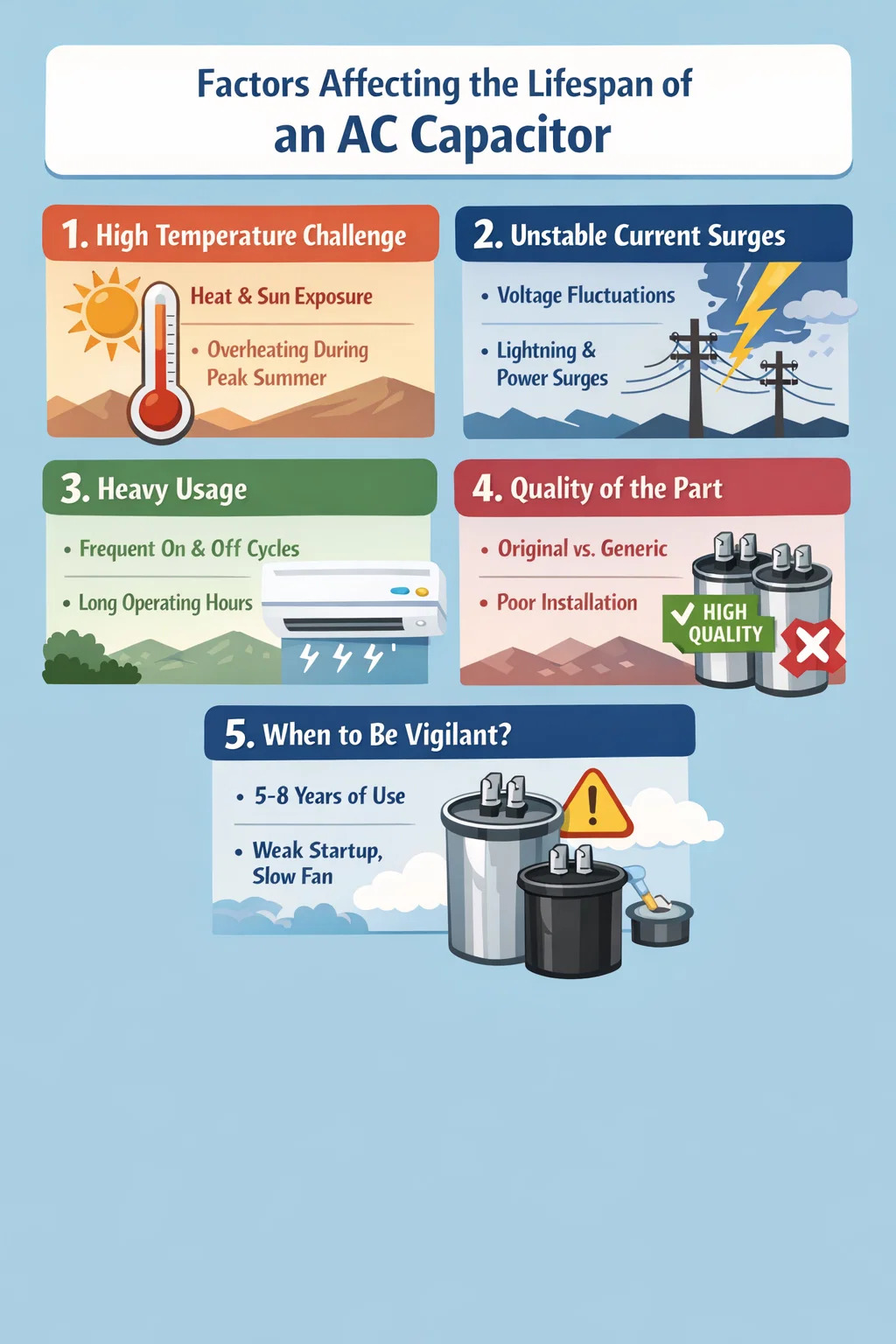 Broj pokretanja: Kondenzator najjače radi tijekom pokretanja. Ako često uključujete i isključujete klima uređaj, ili ako je termostat neispravno postavljen, zbog čega se kompresor često uključuje i zaustavlja, AC kondenzator će se vrlo brzo istrošiti.